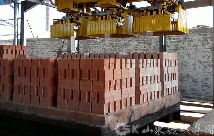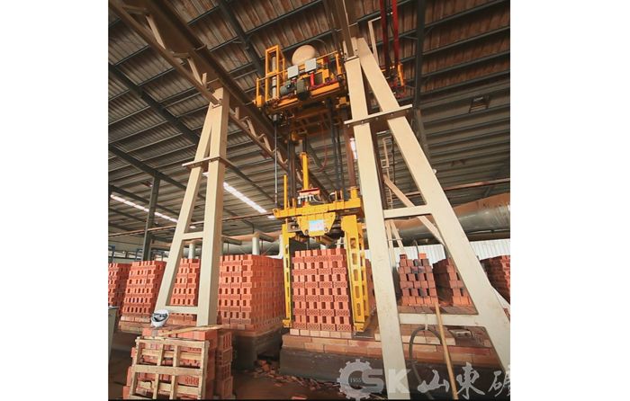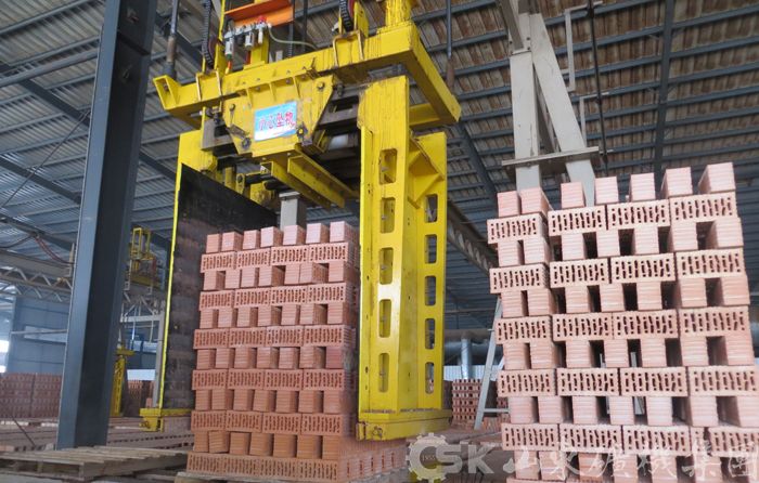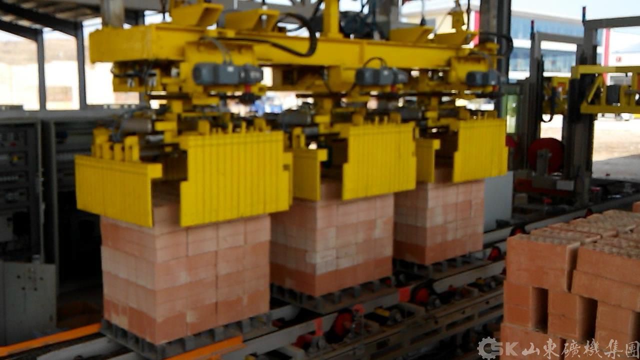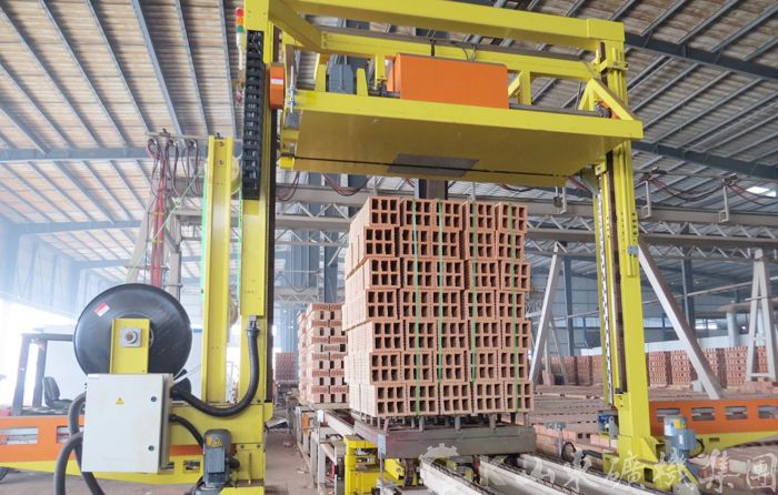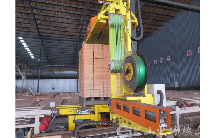 UBS-1400卸垛捆扎系统 我公司生产的卸垛捆扎系统可以将焙烧好的砖整垛或者分层自窑车上卸下,并实现自动捆扎打包,整个过程由PLC自动控制。本套系统彻底改变了传统意义上的必须有托盘捆扎打包,可以实现无托盘捆扎打包,既节省了大量的人力,又大大降低了必须采用托盘而产生的生产成本,这必将是砖瓦行业自动化领域中的又一次革命。