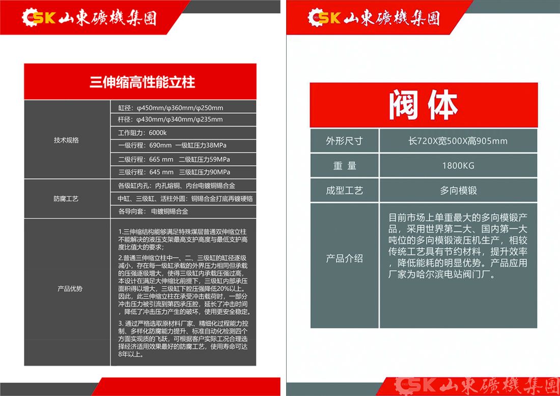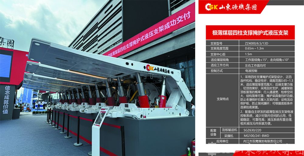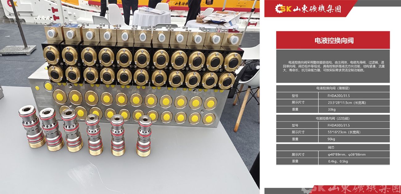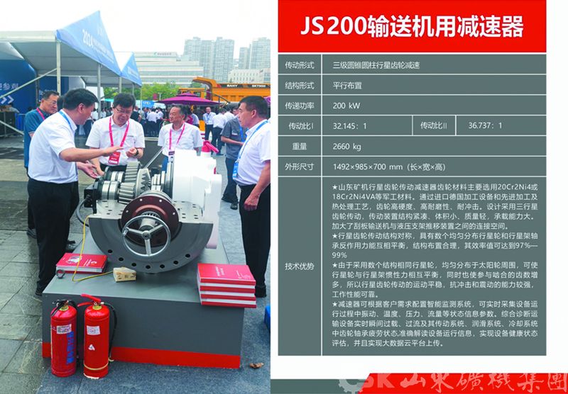 主要展示了三伸缩高性能立柱、双伸缩高性能立柱、多项模锻阀体、整体精锻的齿轨轮、 JS200输送机用减速器、矿用高强度圆环链/紧凑链、电液控转向阀等关键精品零部件
