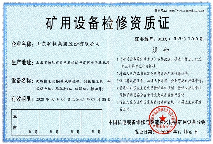 该资质是矿用产品维修服务综合实力的衡量标准,也是对我公司成熟产品服务管理体系的印证,更突显了公司产品经营的专业化服务特色。此次认证成功,即丰富了我公司的业务类型,也有助于对以往服务交付模式做进一步的优化与完善,为公司下一步更全面的服务于市场、开发新的业务领域提供了有利保障。